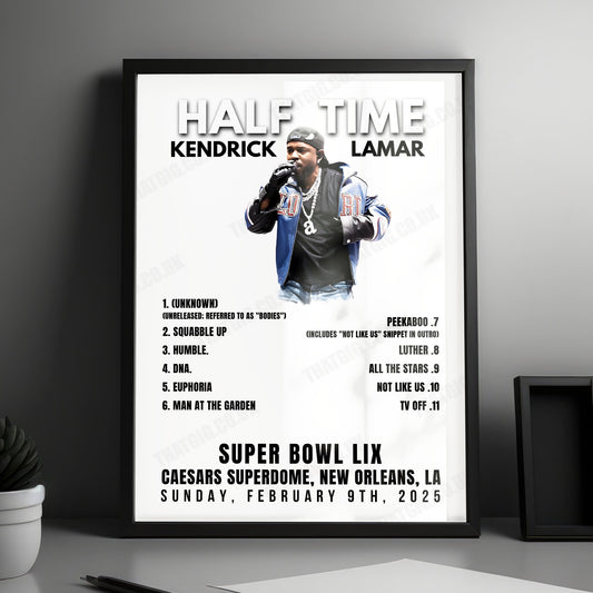 Kendrick Lamar Setlist Poster - Halftime Super Bowl LIX, Caesars Superdome, New Orleans - February 9th, 2025