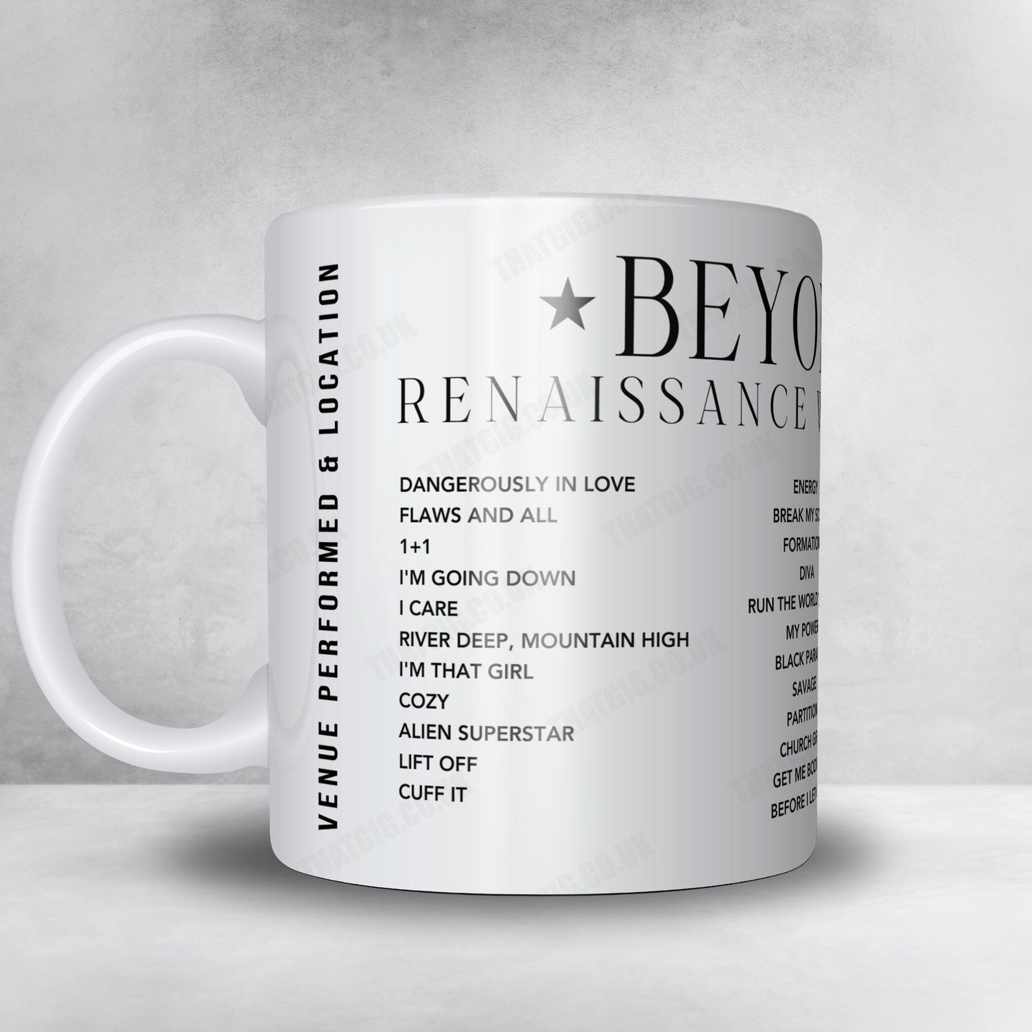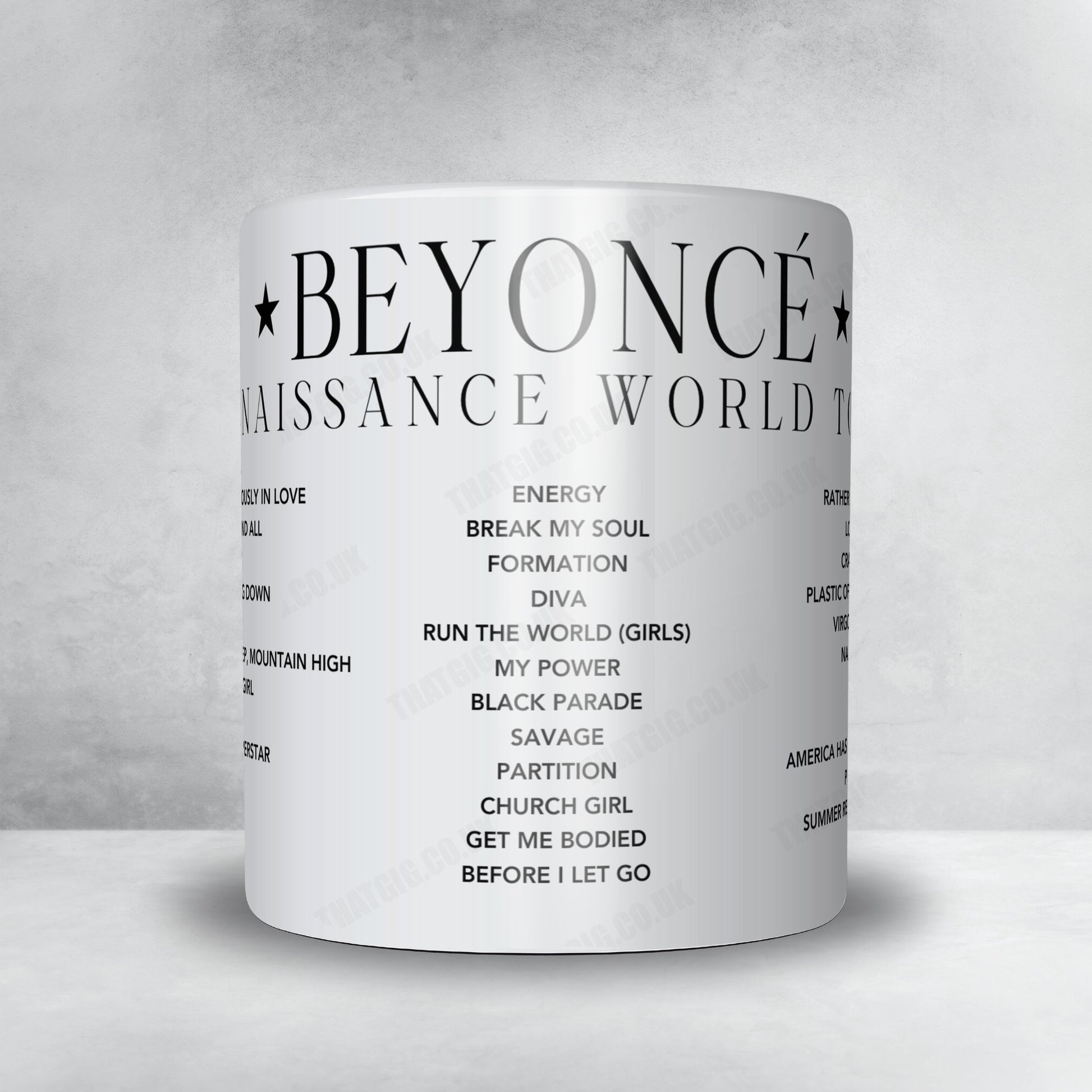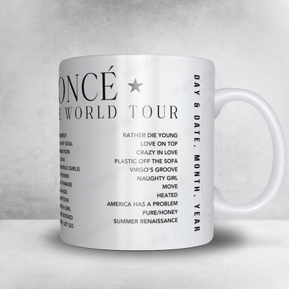 Bring the magic of Beyoncé's concert into your home with this setlist mug. Whether you're a die-hard fan or simply appreciate great music, this mug is the perfect keepsake to cherish the memories of an unforgettable night. Share the love for Queen Bey with friends and family by gifting them this one-of-a-kind mug!